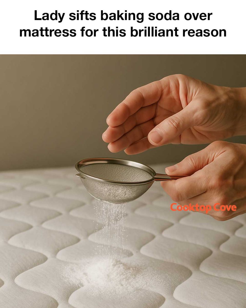 Lady sifts baking soda over mattress for this brilliant reason