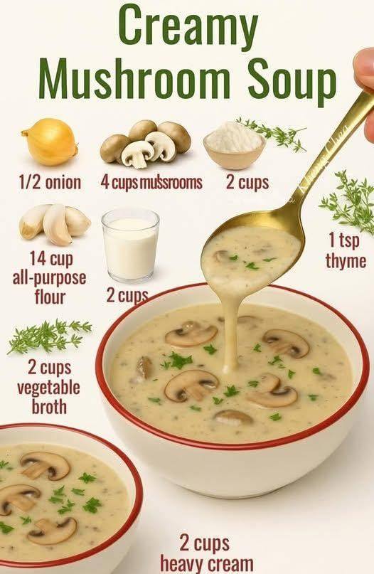 Creamy Mushroom Soup Ingredients: 3 tablespoons butter ½ onion, finely chopped 2 garlic cloves, minced 4 cups mushrooms, sliced (cremini, button, or a mix) ¼ cup all-purpose flour 2 cups vegetable broth 2 cups heavy cream 1 teaspoon thyme (fresh or dried) Salt and black pepper, to taste Optional: Chopped parsley for garnish   Instructions: … Read more