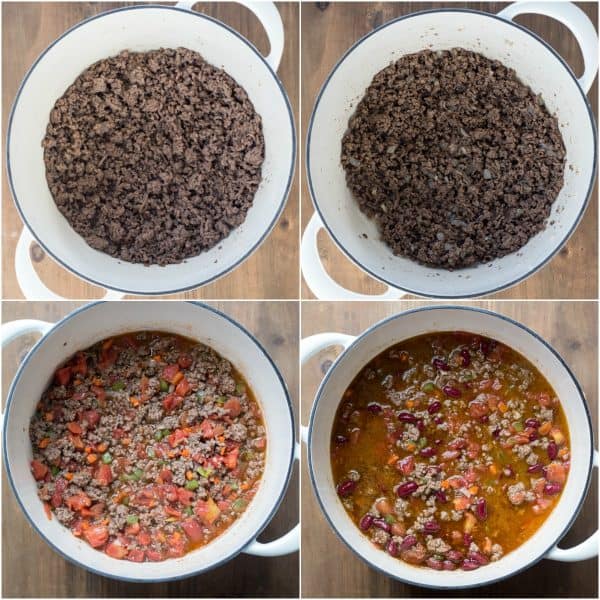 Brown beef in a Dutch oven over med-high heat, breaking up the meat while stirring.